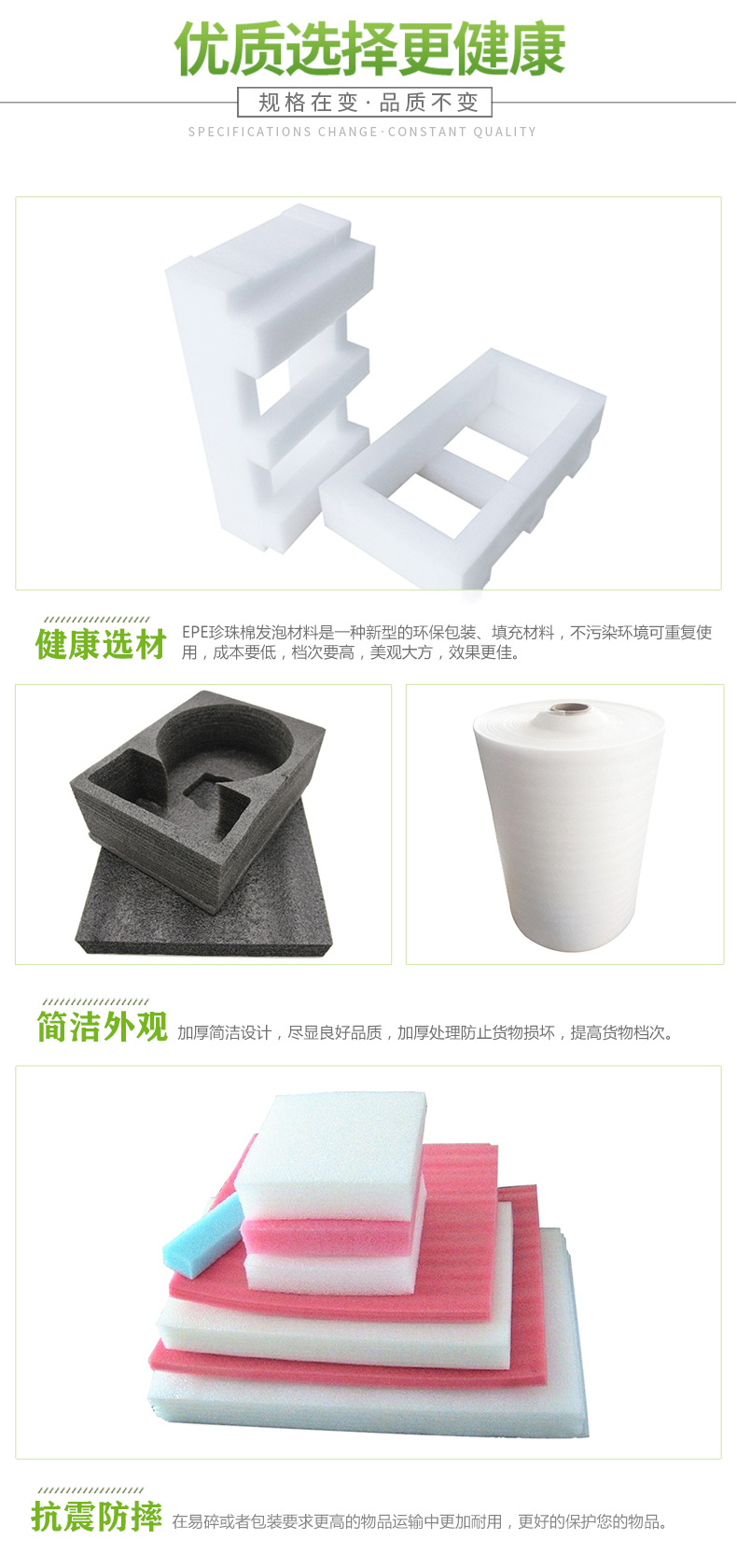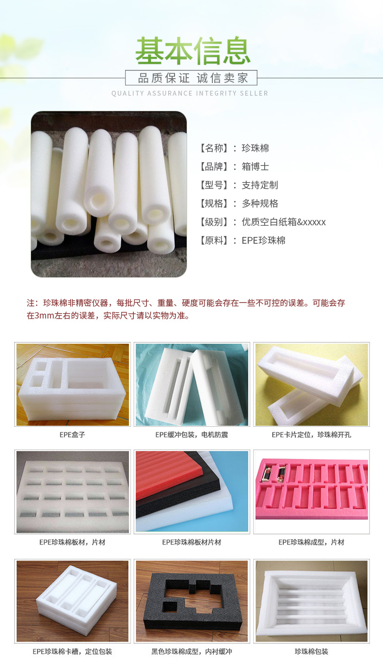正是因為珍珠棉的種類多所以也就會使得它們的使用能夠滿足更多的使用需求,這也是因為生產(chǎn)技術(shù)的進步所以能夠使得它們的發(fā)展空間更加的大。EPE珍珠棉是屬于一種新型的包裝材料,它們是由密度小的聚乙烯脂經(jīng)過物理發(fā)泡方法而產(chǎn)生很多氣泡的一種物品,實際對于它們的使用也是很多。此種類型的物品使用的用途也是很多,其被廣泛的用于汽車的坐墊、抱枕、工藝品、陶瓷、家電、五金制品等領(lǐng)域,在這些領(lǐng)域其都是能夠起到很好的包裝作用。